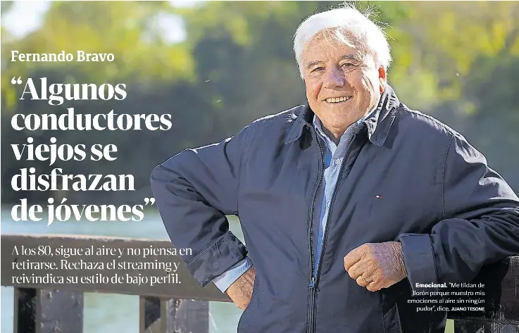 Heredero de una tradición radial inconfundible y fundacional, cuando se acerca nos envuelve en su carisma reconocido, familiar. Dueño de una imagen y una voz que nos acompaña desde siempre, Fernando Bravo nos citó en la zona del Golf Club de Palermo y posa junto al lago. Hace pocos días cumplió 80 años y es la primera entrevista que da inaugurando esta nueva década de su vida.